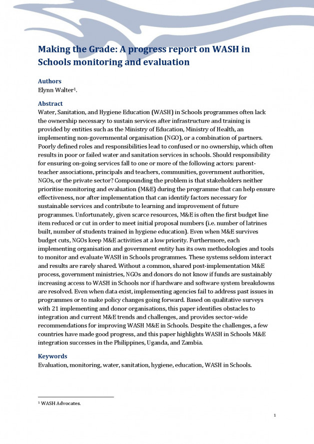 When resources and funding are scarce it is often the monitoring and evaluation of WASH in Schools programmes that are cut – or given a low priority. However, effective monitoring and evaluation can be the key to a sustainable initiative. This progress report found that each implementing organisation or government body has its own method of evaluating a scheme’s success and few of these methodologies and tools interact and results that may help improve schemes are rarely shared. Using qualitative surveys the report identifies obstacles to integration and current trends and challenges in monitoring and evaluating programmes.
